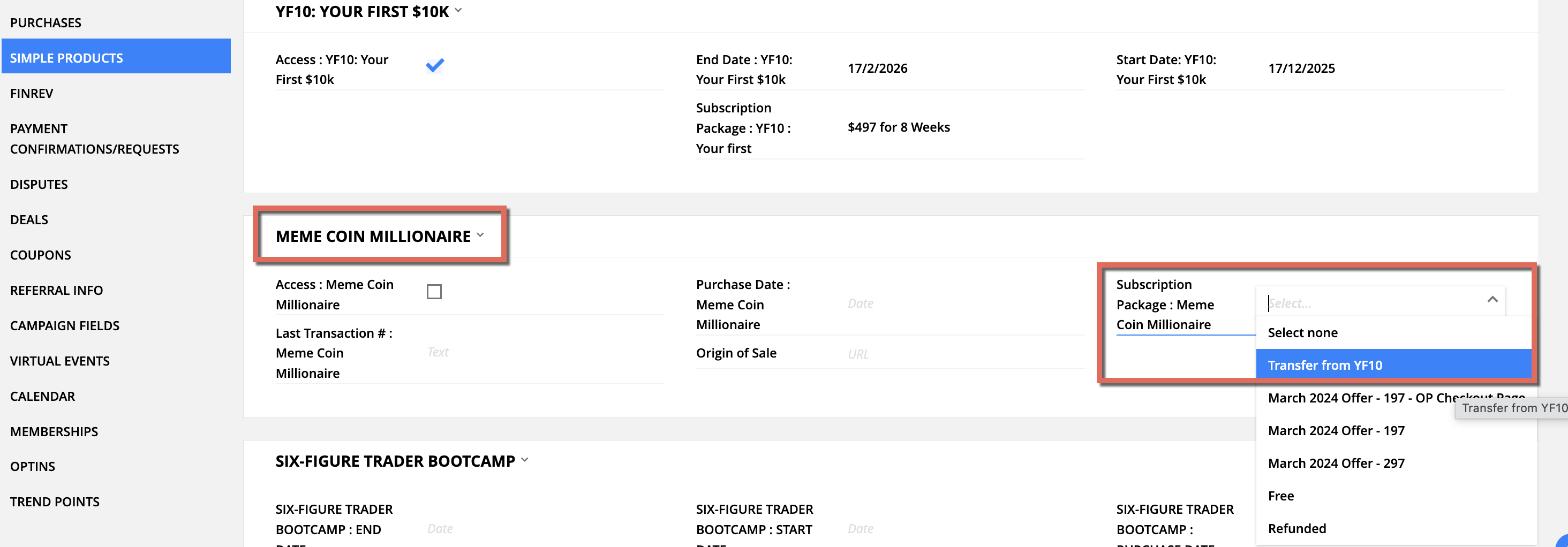 - Check the 'Simple Products' tab to find out if the client is already in Meme Coin Millionaire*. Ensure you search thoroughly as per the *NOTE below.