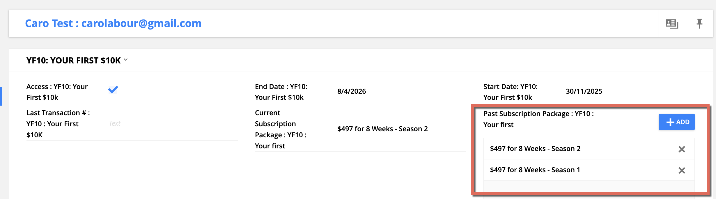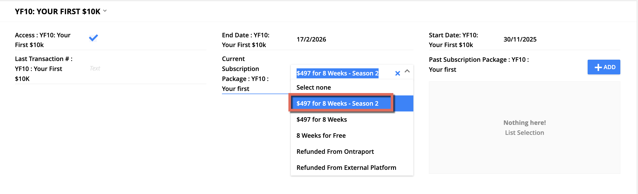 If a member has purchased access to both Season 1 and Season 2, both subscription packages will be displayed in the 'Past Subscription Package' field.