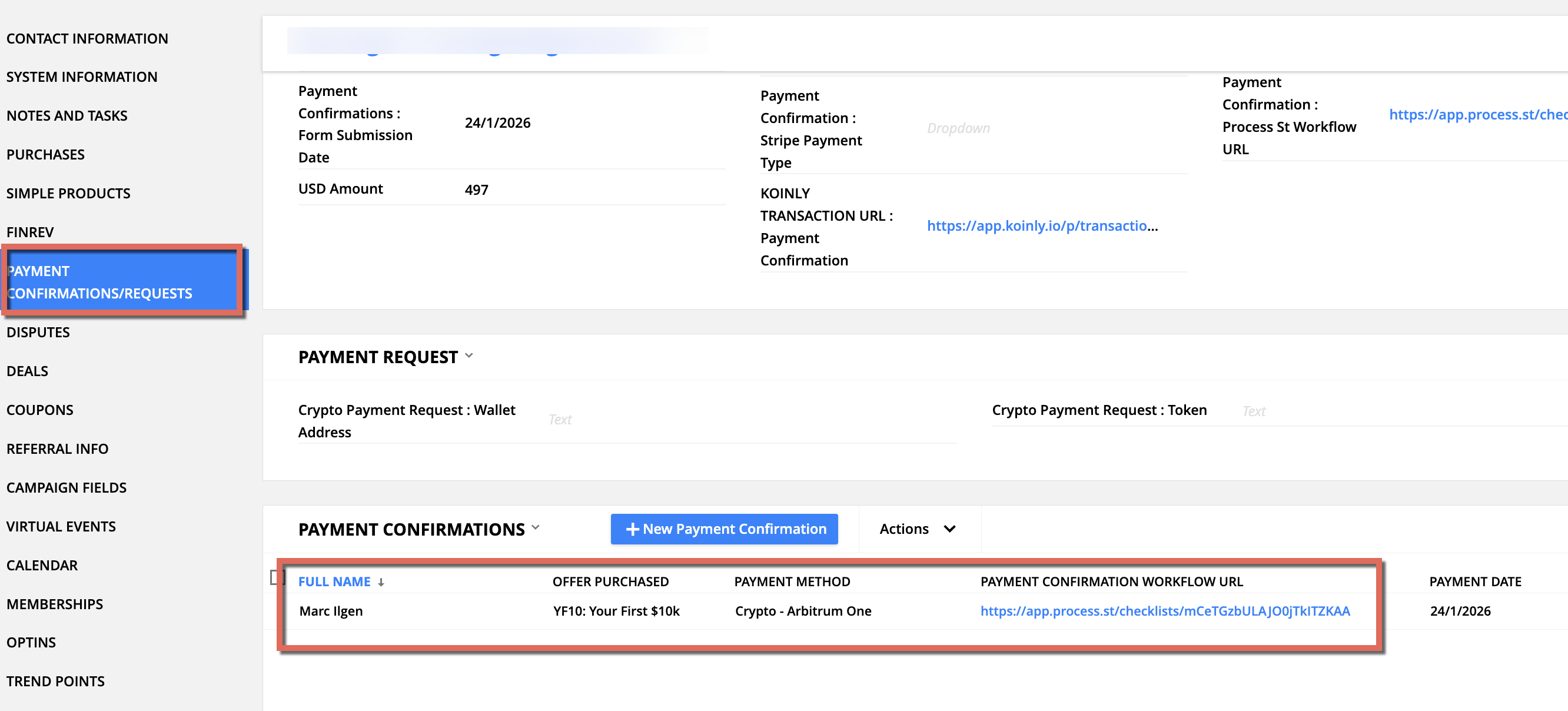 - Search the 'Payment Confirmations/Requests' tab for a corresponding crypto verification:
